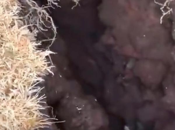芝生の下の地層までもがよく見えるくらいに大きな地割れ。