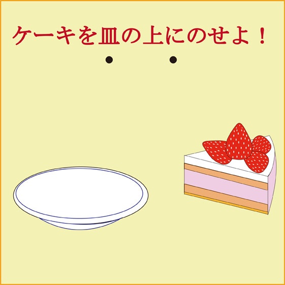 1枚の皿とイチゴが4個ものっているおいしそうなケーキがあります。でもちょっと待ってください。ケーキはとてもおいしそうなのですが、皿にのっていません。このままでは食べることができません。折角ですから、コーヒーか紅茶を飲みながらゆっくりとケーキのおいしさを楽しみたいものです。まずはケーキを皿にのせる方法を考えてください。