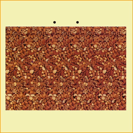 こんな絵を見たことがありませんか。色々なナッツが描かれていますか、しばらく見ていると絵の中にかわいらしい恐竜が見えてきます。ステレオグラムとかステレオアート、3Dアートなどといわれる絵です。もし、あなたがこの絵の中の恐竜を簡単に見ることができるならば、ケーキを皿にのせることができます。