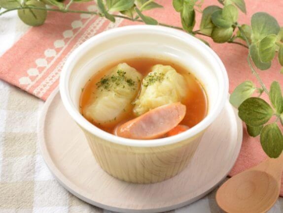ロールキャベツ2個・ソーセージ・にんじんを、高リコピントマトペースト使用のトマトスープに仕立てた。