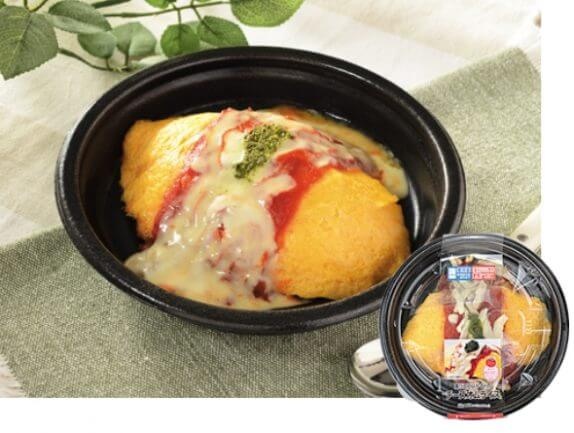 高リコピントマトペーストを使った濃厚トマトソースの上に、バジルソースとレンジでとろけるチーズをのせたカプレーゼ風のオムライス。チキンライスにも高リコピンペーストとソースを使い、ふわふわの玉子と組み合わせた。