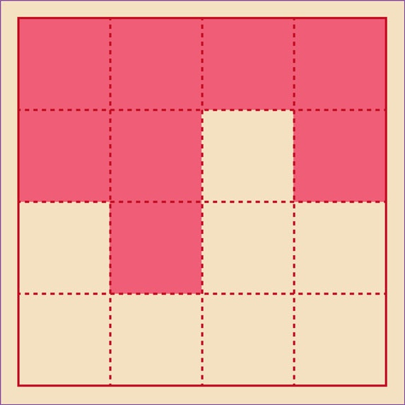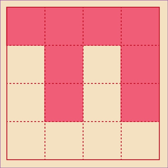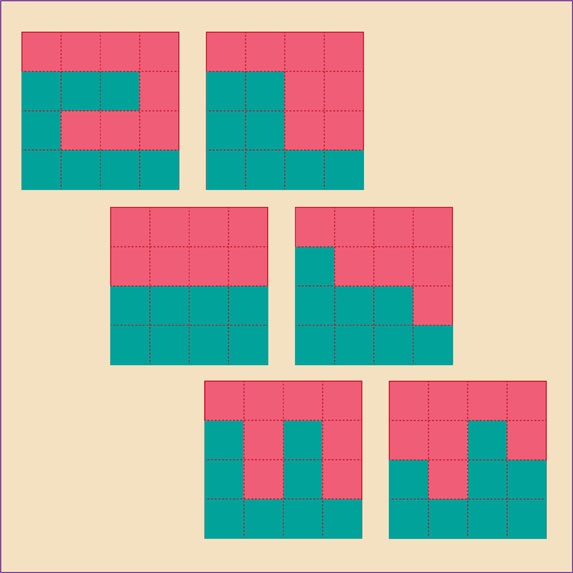 正方形を形も大きさも同じになるように、点線に沿って2つに分割してください。分割の方法は6通りあります。あなたはいくつのの方法を見つけ出すことができるでしょうか。図形を見たときに、その図形の大きさや形状などを素早く把握して問題を解決してしまう人がいます。もしあなたがそのような人ならこの問題は簡単すぎるかもしれません。