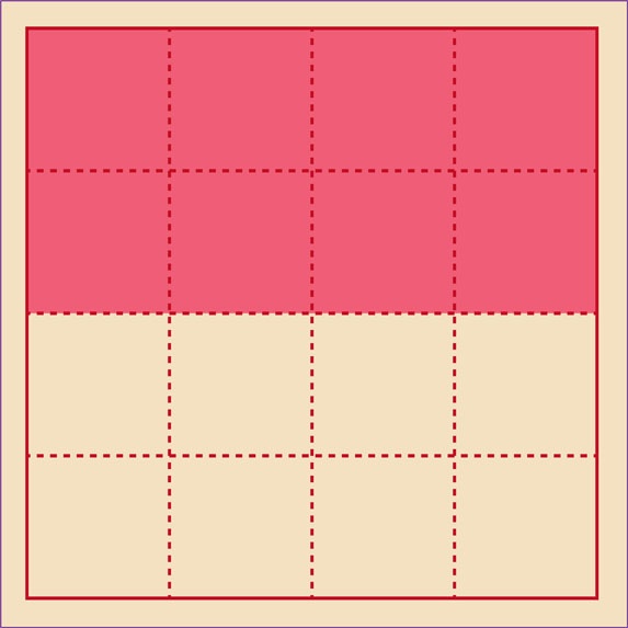 上半分とした下半分に分割しました。これで正方形を2つに分割できました。「なんだ、簡単だ。では、左右に分割しよう!」なんて考えている人はいませんか。上下に分割した答えと左右に分割した答えは同じです。90°回転すると重なります。