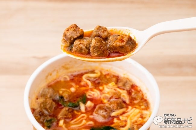 次に気になる謎肉へ。1cm程度と大きい。同社によれば赤味噌、豆板醤、花椒を加えた特別なもので「特製肉味噌担々謎肉」と呼ぶらしい。謎肉へのこだわりが伺えるがネーミングセンスはいかほどか。