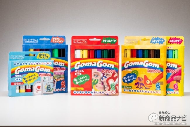 水で落とせる新感覚クレヨン「GOMAGOM(ゴマゴム)」シリーズは、「カラフルメイク」のほかに、お絵描き・工作に特化した「スタンダード」(税別380円)と、蛍光色の「ネオンカラー」(税別400円)、布用の「カラフルファッション」 (税別480円)、窓用の「カラフルウィンドウ」(税別480円)もラインナップ。