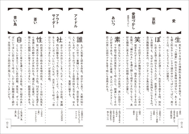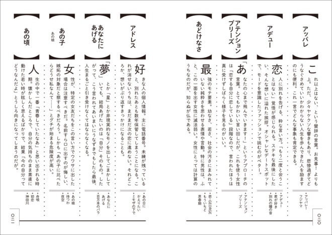 例えば、ア行で始まる単語には「あんちくしょう」「映画みたいな」「おでこにキスで」、マ行で始まる単語には「摩天楼」「モノクロームの」など、昭和歌謡をリアルタイムで聴いていた人にとってはあるある感満載なのです。