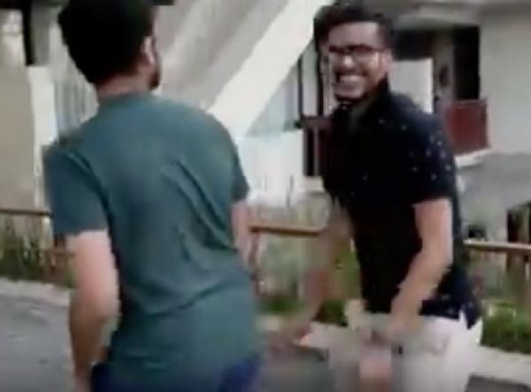 顔面にケーキを当てられる刹那、押さえつけられた男性が頭を下に振って避けることに成功!