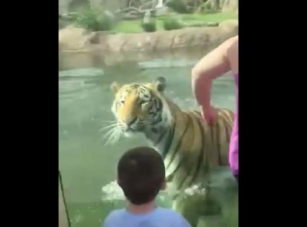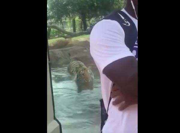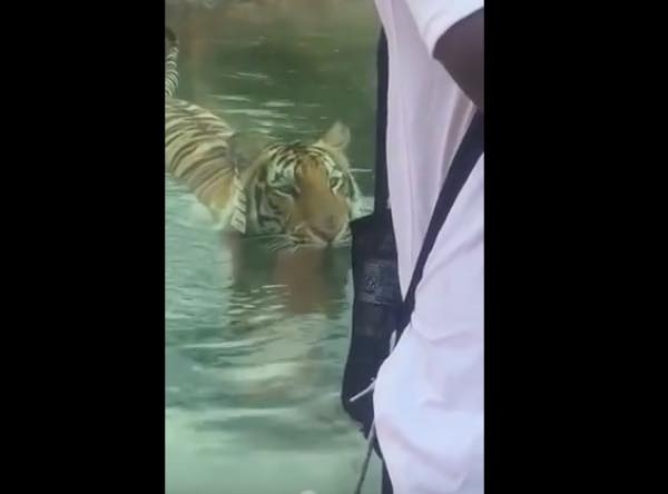 まるで狩りのよう! トラがじわじわと背中を向ける男性に近づき襲いかかるが…
