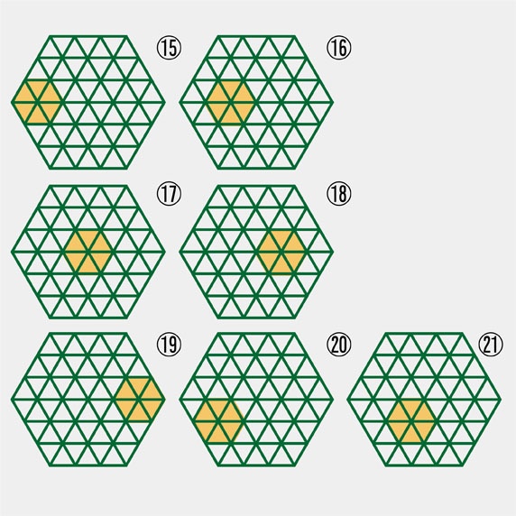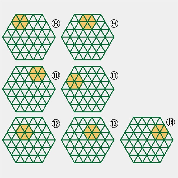 8番目から14番目まで見つかりました。中位の大きさの正六角形と違って、こちらは随分とたくさんありそうです。2度数えたり抜かしてしまったりしないように注意してくださいね。あといくつあるのでしょう。