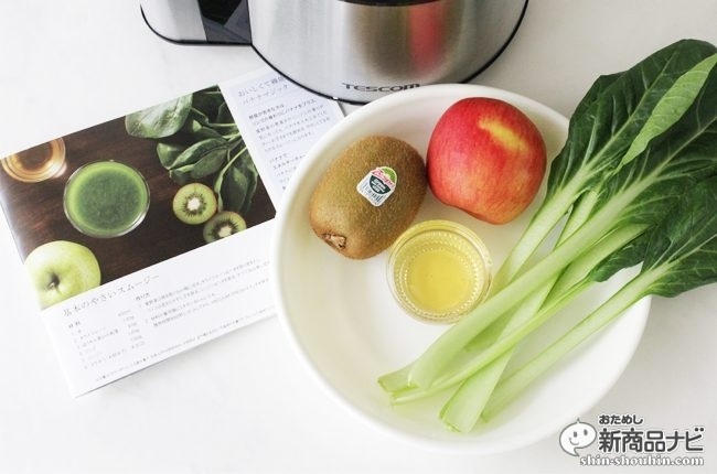 レシピブックより基本のやさいスムージー(グリーンスムージー)を作ってみよう。準備した食材は、小松菜、りんご、キウイフルーツ、はちみつ。