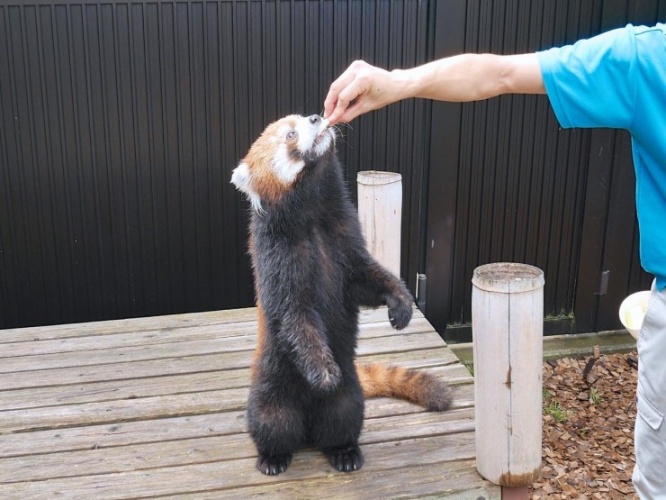 竹が主食で木登り上手なレッサーパンダは、リンゴが大好物。主食の竹の葉は毎日動物園の裏山から新鮮な竹を切って与えているのだそう。