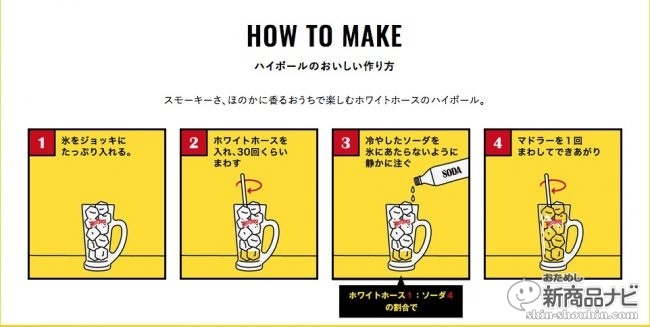 公式サイトでは以下のように、『ホワイトホース ファインオールド』を使用したハイボールの作り方を解説してある。