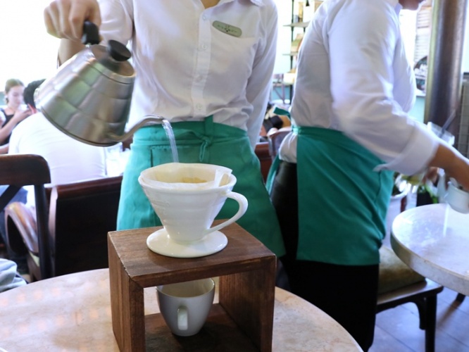 温かいコーヒーが飲みたければ、目の前でドリップしてくれるデモンストレーション付きコーヒーPOUR OVERは45000ドン(約225円)もおすすめです。