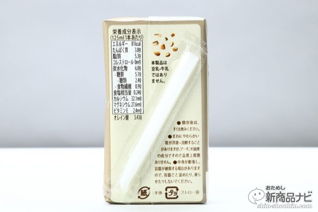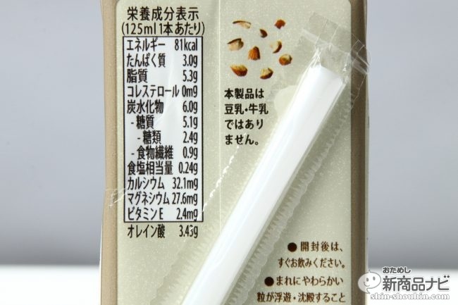 わずか125mlを飲み比べしているうちに襲われた満腹感。もともとはナッツであり、皮をむいたアーモンドを丸ごと微細化/粉砕して、独自の無菌充填技術で閉じ込めたものである。