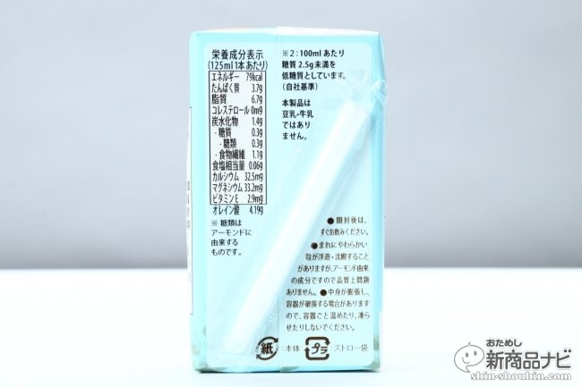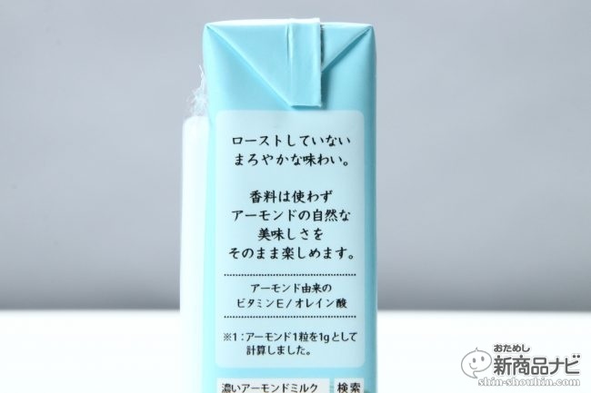 ミルキーさが際立ち、飲んだ後味がわずかに違和感があるが、プレーンで砂糖不使用の低糖質タイプ(0.3g)でこのクオリティーはすごいと思う。豆乳慣れしている人なら、何の問題も無く一気飲みできるレベル。たった125mlなのに、アーモンド粒換算で12.5粒という濃縮ぶり。これで一日のビタミンE摂取量の目安の半分近くを摂ることが可能だ。またアーモンドが苦手な人でも風味が強くないので飲みやすい。