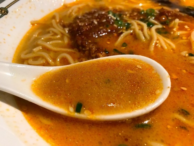 濃厚なゴマのコクにスープのウマミ、そして坦々そぼろ。それらの美味しい味わいが溶け込んだスープはそれだけで絶品の味わいです。