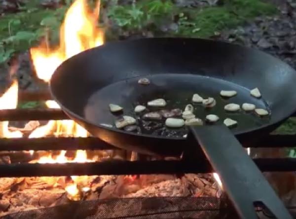 そしてキャンプの醍醐味の一つとも言える自然の中での料理。にんにくやジャガイモとともに肉を豪快に焼いていく。
