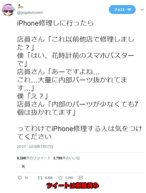 結局、この客はどこでスマートフォンを修理していたのだろうか? そして何故ツイートを消したのか? 経営会社も名誉回復をしたいようで、平和的な解決を望んでいるようだ。