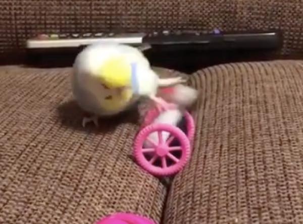 こちらソファの間で遊んでいるインコ。車輪がついたペンギンのおもちゃと戦っているようだ。