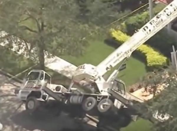 なんという不運…! クレーン車が倒れて立派な家が真ん中で切断される。