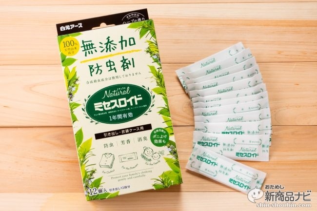 『Natural(ナチュラル)ミセスロイド』は、天然系防虫剤のパイオニアである白元アース株式会社(東京都台東区)が開発した、1年間有効の100%天然由来の防虫剤。合成殺虫成分不使用の無添加処方にもかかわらず、大切な衣類を繊維の虫からしっかりガード。しかもターピネオール類とティーツリーオイルの効果で、ダニを収納空間内に寄せ付けない。