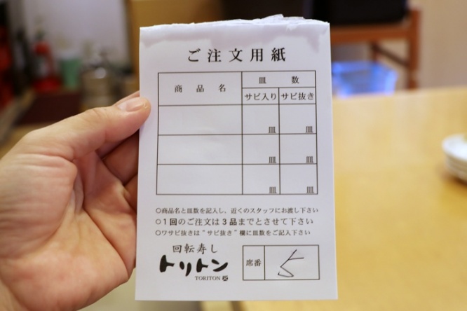 トリトンは回転寿しなので、目の前に流れてくる好きなお寿司を取るしくみですが、席にある注文票に書いてスタッフに渡し、握ってもらうことも可能です。