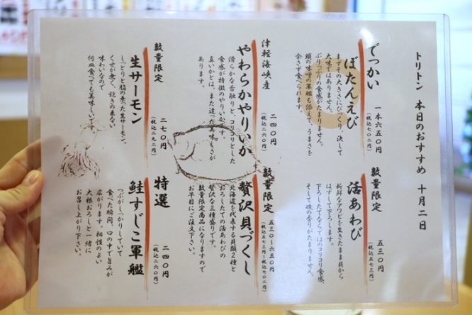 上のレギュラーメニューとは別に「本日のおすすめ」メニューもありました。この日のおすすめは、でっかいぼたんえび、やわらかやりいか、生サーモン、活あわび、贅沢貝づくしなど。