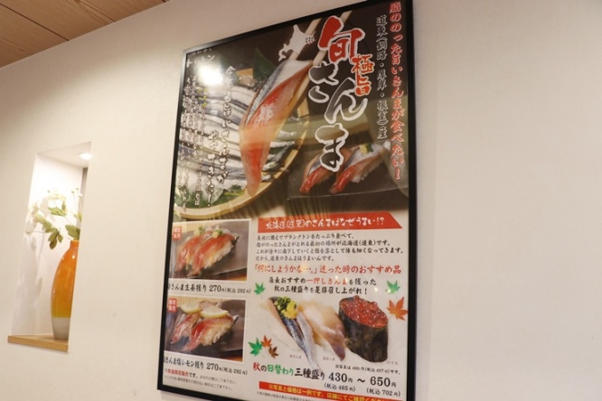 立て看板にも書かれていた旬のさんま握りも写真つきのポスターだとなおさら食欲をそそります。生姜もいいけれど、塩レモンも捨てがたい……と迷っている間に、番号が呼ばれて、席へと案内されました。
