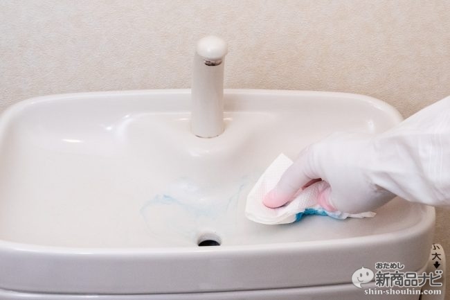トイレタンクの上部にある手洗いは、シートなどに付けて拭くまた、トイレの上部にある手を洗う場所は、ザラザラとした水アカ汚れが気になる場所。お掃除シートなどに「ウルトラハードクリーナー トイレ用」を付け、磨いていこう。