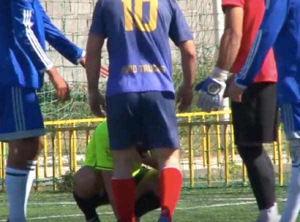 顔を押さえてうずくまる審判。そして「どーしてくれんだよォ!!」と審判に迫る相手チーム。