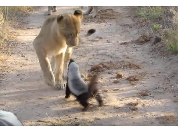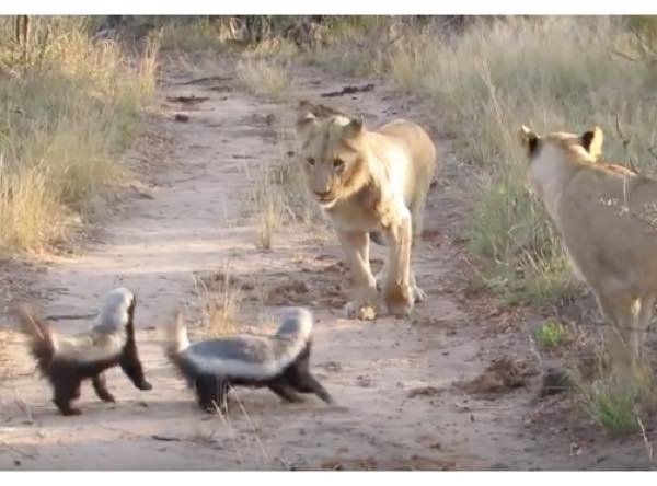 こちらの動画では、二匹のラーテルがライオンたちに遭遇し・・・