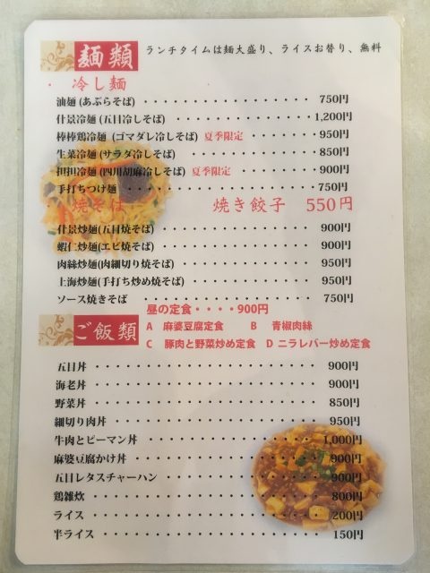 いわゆる町中華とは異なり、彼の地の職人さんが腕を振るうタイプのカジュアル中華なので、麺類メニューはかなり豊富。昼定食や丼物も揃っています。ランチは麺大盛り、ライスおかわり無料。夜は冷菜や大皿料理などで宴会も可能のようです。