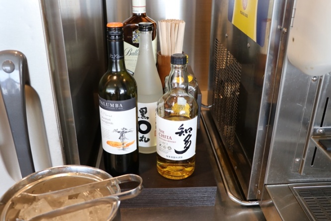 お酒はワインやウイスキーのボトルが置かれていました。「知多」があるのが中部国際空港らしいですね。
