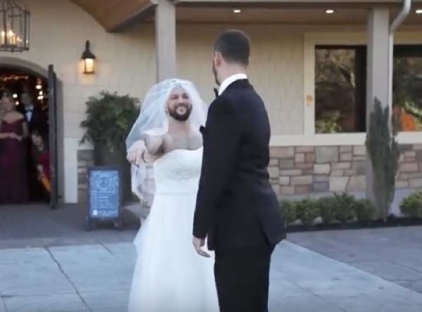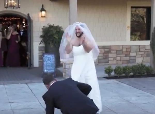親友である花婿のために、文字通り一肌脱いだ男性。サプライズは大成功のようだ。(もちろんこの後本物の花嫁が登場。)