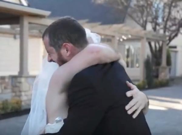 こちらの動画では、後ろを向いた花婿を花嫁が肩を叩いて振り向かせるという演出。