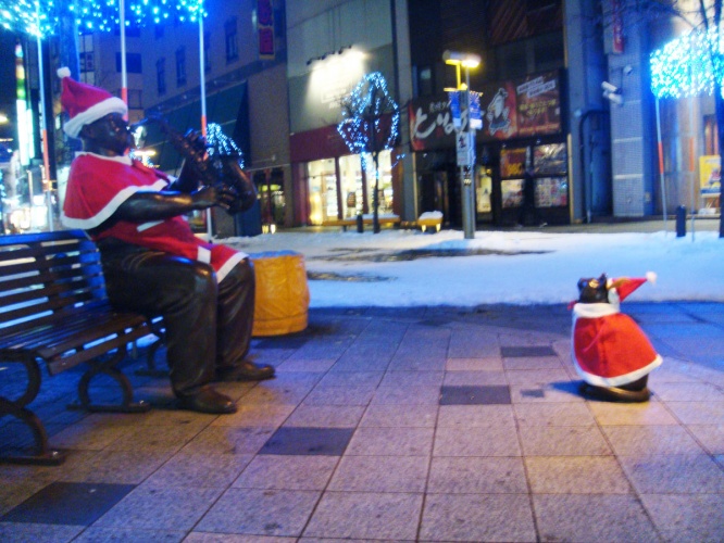 寒くないようにと、冬になると色々な衣装を着せてもらっています。旭川の冬は寒いですから...。今日はサンタランなのでサンタクロースになっていました。