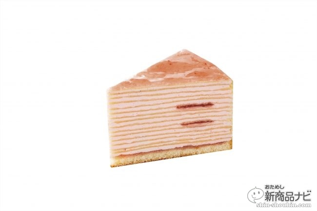 福岡県の有名苺ブランドの1つ「あまおう」を使用した『あまおう苺ソースのミルクレープ』(価格 税抜 369円・横100mm×高さ70mm)。何層も重ねたクレープ生地の間にあまおう苺ソース入りのカスタードクリームをサンド。さらに、あまおう苺ソースをそのままサンドした層もあり、アクセントとして楽しむことができる。まさに「あまおう」づくしの一品だ。