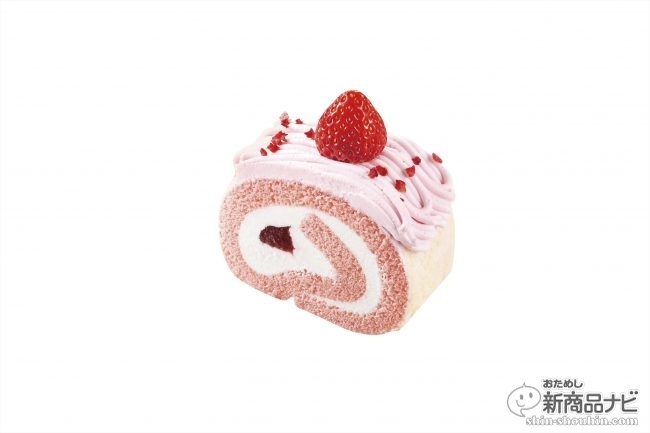 『苺のクリームロール』(価格 税抜 369円・サイズ 横85mm×幅39mm×高さ70mm)は、シャンテリークリームをピンクのスポンジで巻いたロールケーキ。中央には苺ソースが入っていて断面もなんだかかわいく感じる。上面には苺クリーム、苺のフリーズドライ、そして苺が飾られている。
