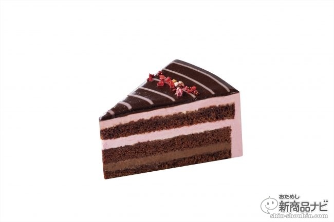 苺もいいけどチョコも食べたいという人にはこれ! 『ザクザクチョコケーキ(苺)』(価格 税抜 369円・サイズ 幅90mm×高さ52mm)。ザクザク食感のチョコバタークリームとストロベリークリームをチョコスポンジでサンドしている。表面のフリーズドライの苺がアクセント。