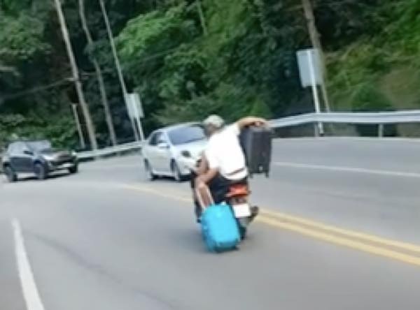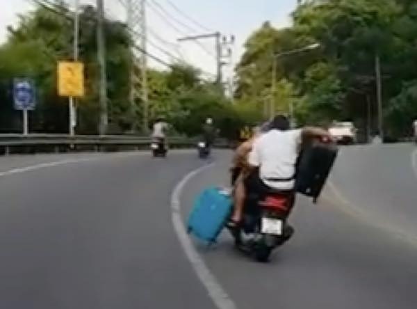危険運転。二人乗りのバイク乗りがスーツケースを引きずって走行!