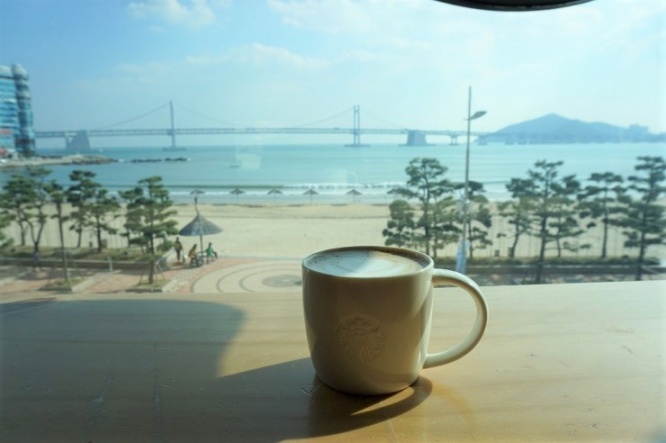 スターバックス広安里店で特筆すべきが、窓際の席からの眺め。ビーチの正面に位置するために、ガラスの向こうに広安大橋が見える景色のよいスタバとして知られているのです。