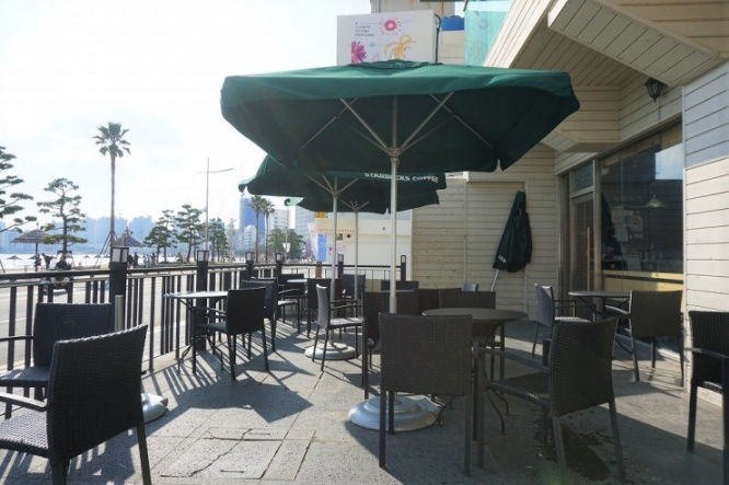 スターバックス広安里店は、道路を挟んでビーチの向かい側。屋外にはテラス席もあり、リゾート感満載です。