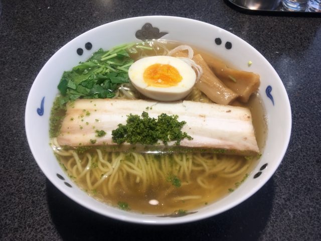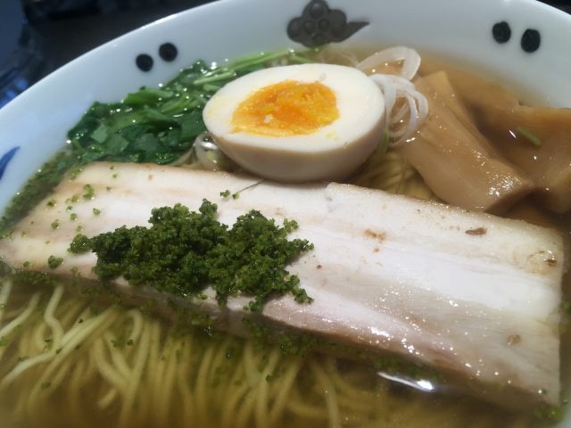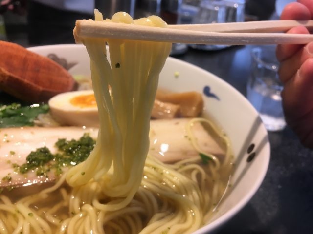 厚削りの鰹節から毎朝丁寧にとられた和出汁と鶏ガラがベースになる塩味のスープは、極めて穏やかであっさりとしつつも、何故かクセになる味わい。そこへ柚子皮の爽やかな香りと苦味が良いアクセントとなっています。そこへ合わせるのは中細ストレート麺。柳麺と言う割にはしっかりとした食感のあるコシの強い麺です。