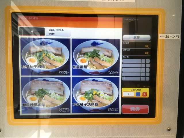 メニューは看板の「和風柚子柳麺」を筆頭に、柚子抜きの「和風柳麺」、焼豚増しの「和風焼豚柳麺」、柚子入り焼豚増しの「和風柚子焼豚麺」というシンプルな構成。サイドメニューにはご飯もの、トッピング各種が取り揃えられています。