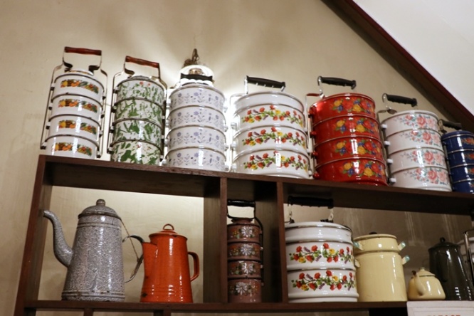 奥にある棚には、お弁当箱でしょうか、ホーロー製と思われるかわいい容器が並んでいました。