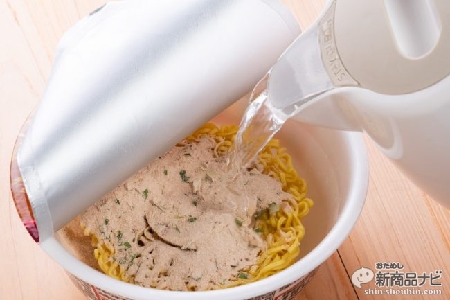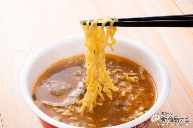 粉末スープを溶かすように湯入れすべしかやくはチャーシューとネギ、ノンフライ太麺を使用したシンプルなもの。熱湯5分でしっかり湯戻しして、いざ食べてみよう。きちんと原材料にカニミソエキス、さらにカニガラ粉末まで入っている念の入りように期待が高まる。ちなみにノンフライ麺は通常湯だけで戻すことが多いが、これは事前に粉末スープを溶かす方式だ。