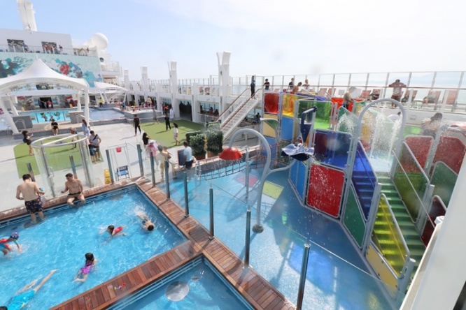 船内には、無料で楽しめるたくさんのエンターテイメントやアクティビティがそろっています。上写真はデッキ16にあるメインプール。ステージやジャグジーも併設する人気エリアです。