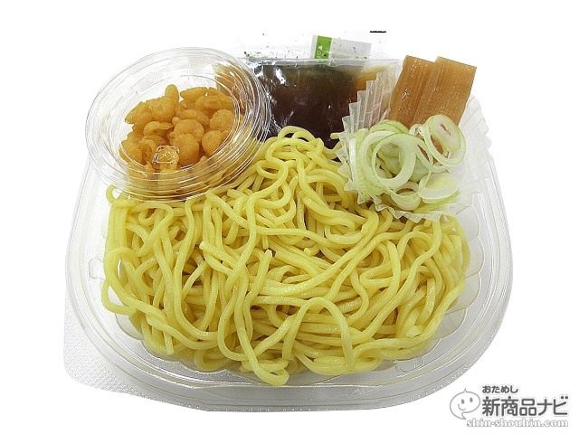 冷たいそばつゆでいただく中華麺。コシとのど越しのよい三層麺に、風味よく甘じょっぱいそばつゆを組み合わせた。ねぎ、メンマ、揚げ玉をトッピング。