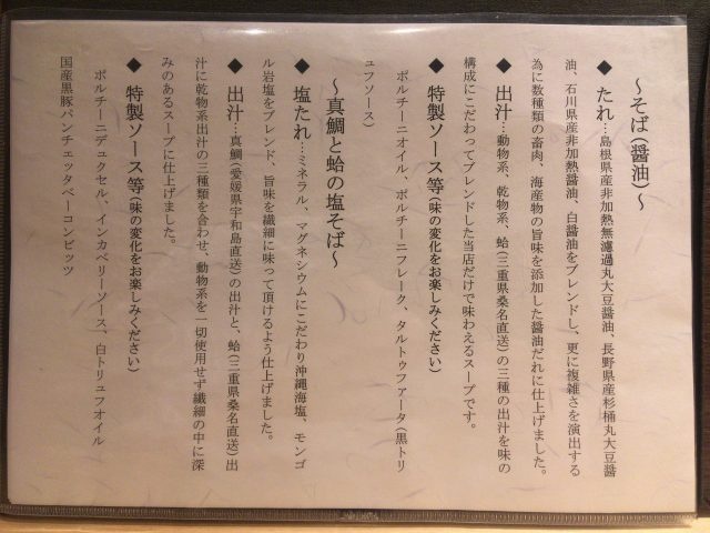 主なメニューは「真鯛と蛤の塩そば」、「そば(醤油)」、「つけそば(塩・醤油)」、「南高梅塩そば」、「焼のり味玉そば(醤油)」、「夜限定蛤の塩細つけそば」、「夜限定鴨脂と蛤の醤油そば」など。「南高梅しらす丼」、「煮豚丼」などご飯ものも充実。その他にトッピング各種、お酒類、おつまみも豊富です。