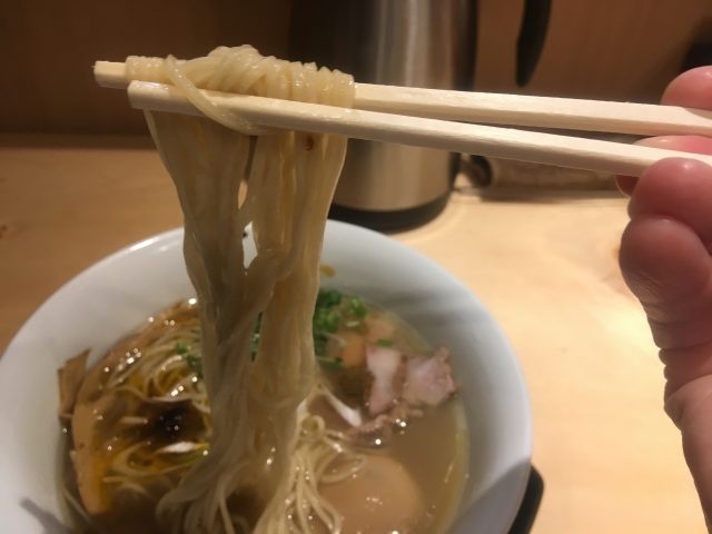 早速スープからいただくと、一口目からじんわりと猛烈な旨味が口の中いっぱいに広がります。上質な塩をブレンドしたタレ、真鯛と蛤の芳醇な出汁、香り高いトリュフオイルが渾然一体となり、上品な繊細さだけでなく、力強さも兼ね備えた艶のある味わいにスープを救うレンゲが止まりません。